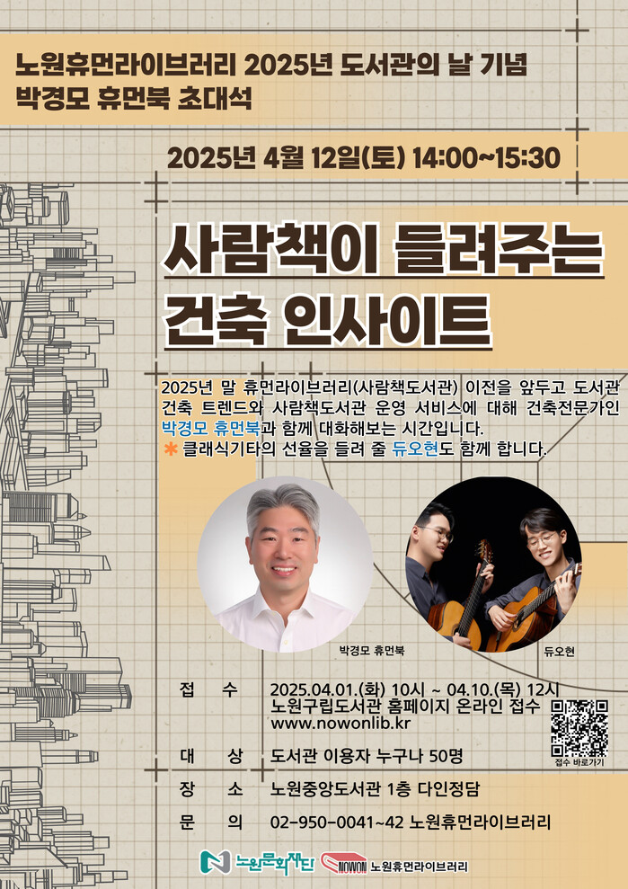 오승록 노원구청장을 포함해 현재 약 800여명이 사람책으로 등록되어 있는 휴먼라이브러리의 4월 초대석은 건축 전문가 ‘박경모 휴먼북’이다. 박경모 휴먼북은 도서관 건축의 트렌드와 사람책도서관 운영 서비스를 주제로 전문적인 통찰을 일반 주민들과 나눌 예정이다.