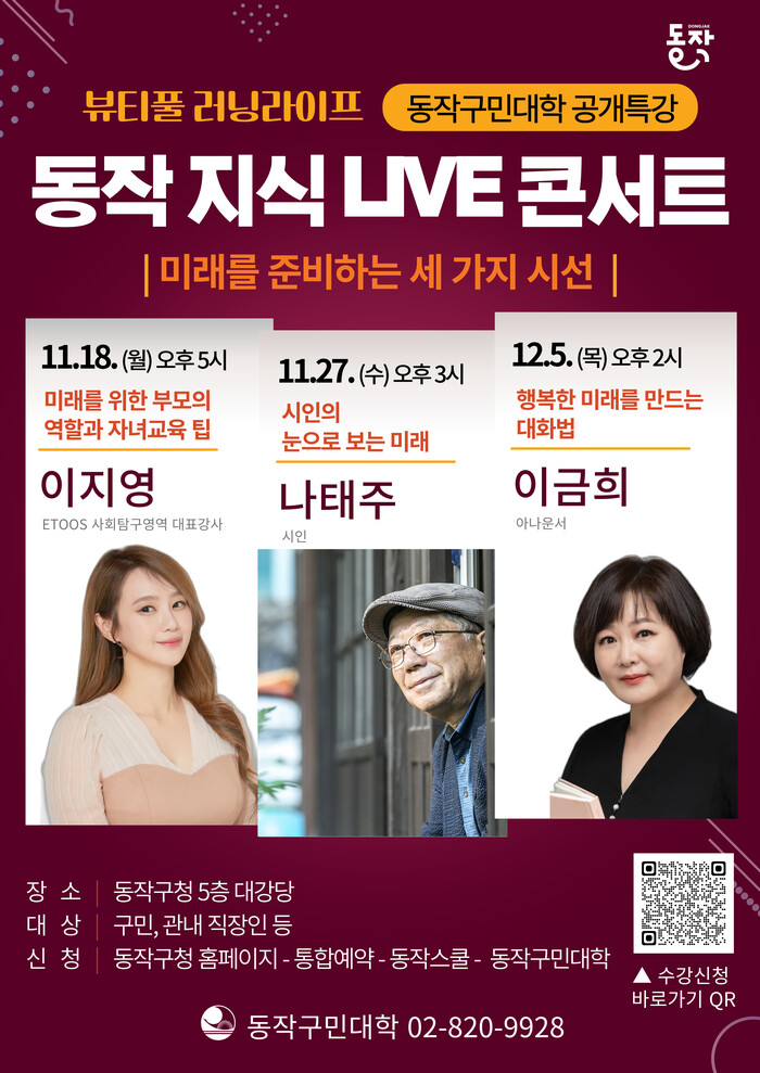 [시민일보 = 여영준 기자] 동작구(구청장 박일하)가 오는 18일, 27일과 12월 5일 동작구청에서 동작구민대학 주관 ‘동작 지식 LIVE 콘서트’를 무료로 개최한다고 밝혔다.