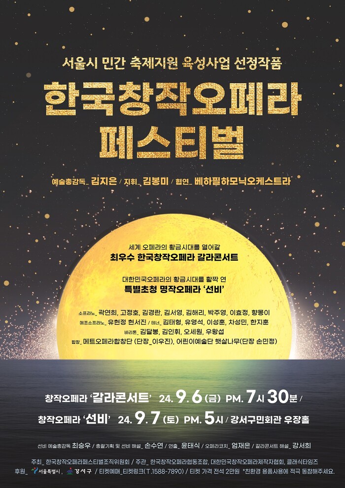 한편, 이번 행사는 서울시 민간축제지원 육성사업에 선정된 것으로, 한국창작오페라의 우수성 홍보와 대중화를 위해 기획됐다. 한국창작오페라페스티벌조직위원회가 주최하고 한국창작오페라협동조합, 대한민국창작오페라제작자협회, 클래식타임즈가 주관하며 서울특별시와 강서구가 후원한다.