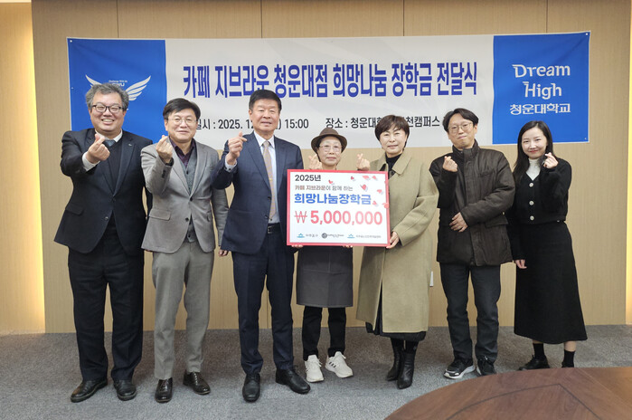 이번 장학금은 청운대학교 학생들이 주로 이용하는 카페지브라운 청운대점의 수익 일부를 지역사회에 환원하고, 학생들의 학업을 지원하기 위해 마련됐다.