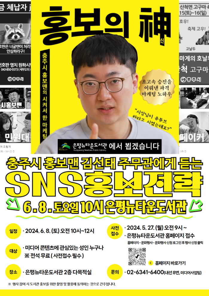 [시민일보 = 이대우 기자] 서울 은평구 구립은평뉴타운도서관은 6월 8일 오전 10시 구립은평뉴타운도서관 다목적실에서 ‘충주시 김선태 주무관 초청 특강’을 개최한다고 밝혔다.