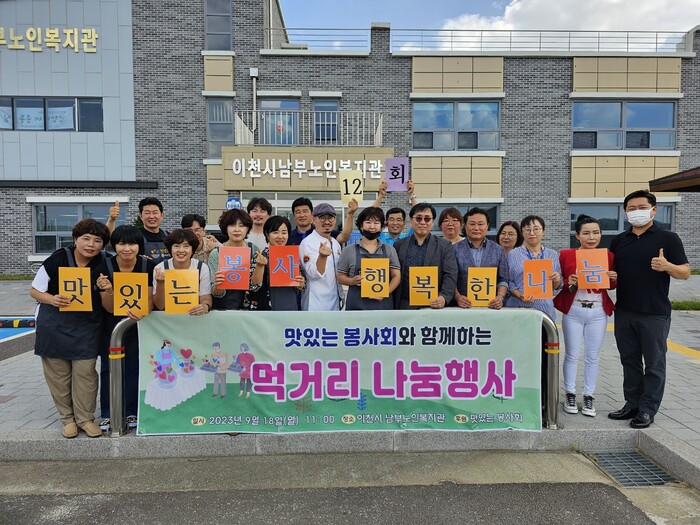 경기 이천시 남부노인복지관은 18일 맛있는 봉사회의 후원으로 복지관 이용 노인들을 대상으로 먹거리 나눔행사를 진행했다. 사진은 이날 행사 관계자들이 기념촬영을 하고 있는 모습. (사진=이천시청 제공)