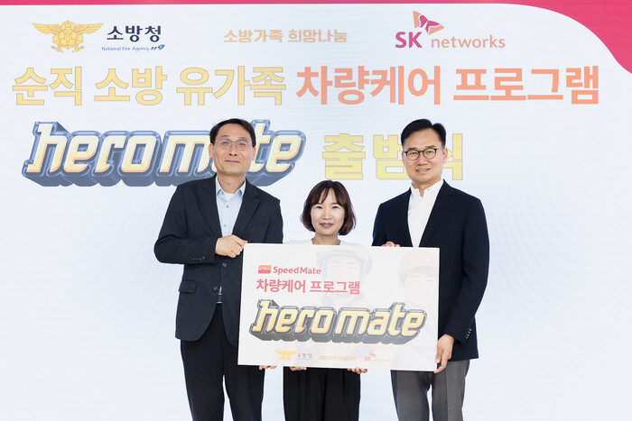 | ▲ 스피드메이트와 소방청이 손잡고 소방공무원 및 유가족에게 정비 혜택을 제공하는 프로그램 ‘히어로메이트’를 마련했다. 18일 서울 종로구 삼일빌딩에서 열린 기념식에는 안무인 스피드메이트사업부장(오른쪽)과 박현숙 소방나눔 희망가족 대표(가운데), 정건일 소방청 보건안전담당관이 참석해 서로 감사와 응원의 뜻을 전했다. (사진=SK네트웍스 제공) |