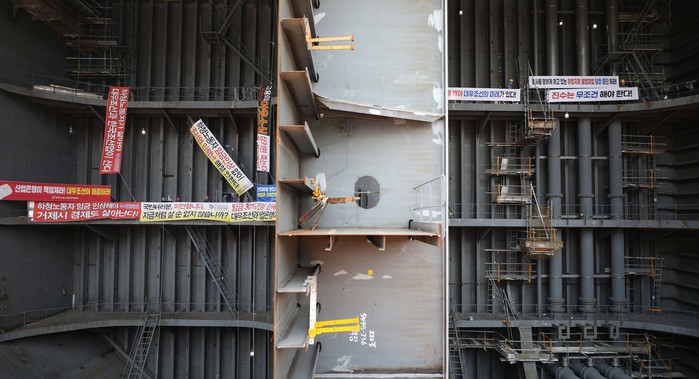 대우조선해양 하청업체 노동조합 파업이 49일째를 맞은 20일 경남 거제시 아주동 대우조선해양 옥포조선소 내 독에서 파업 중인 하청지회(왼쪽)와 파업 철회를 촉구하는 대우조선해양 직원이 벽 하나를 두고 각 농성하고 있다.