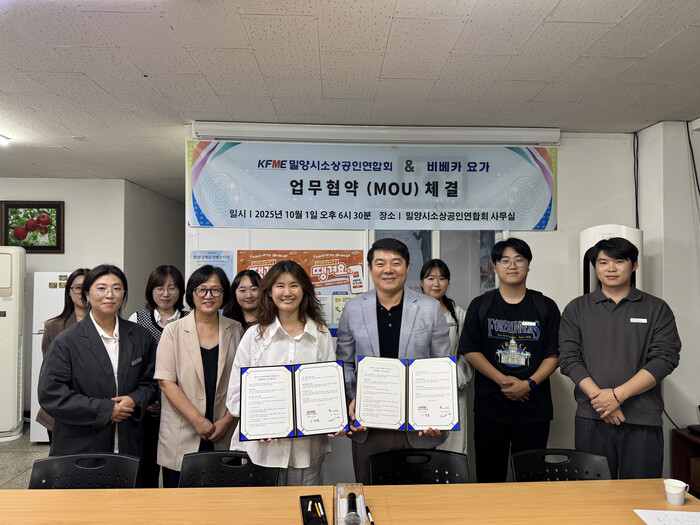 [밀양=최성일 기자] 밀양시 소상공인연합회(회장 신영철)는 지난 2025년 10월 1일, 밀양 선샤인테마파크 입주기업인 비베카 요가와 업무협약(MOU)을 체결했다.