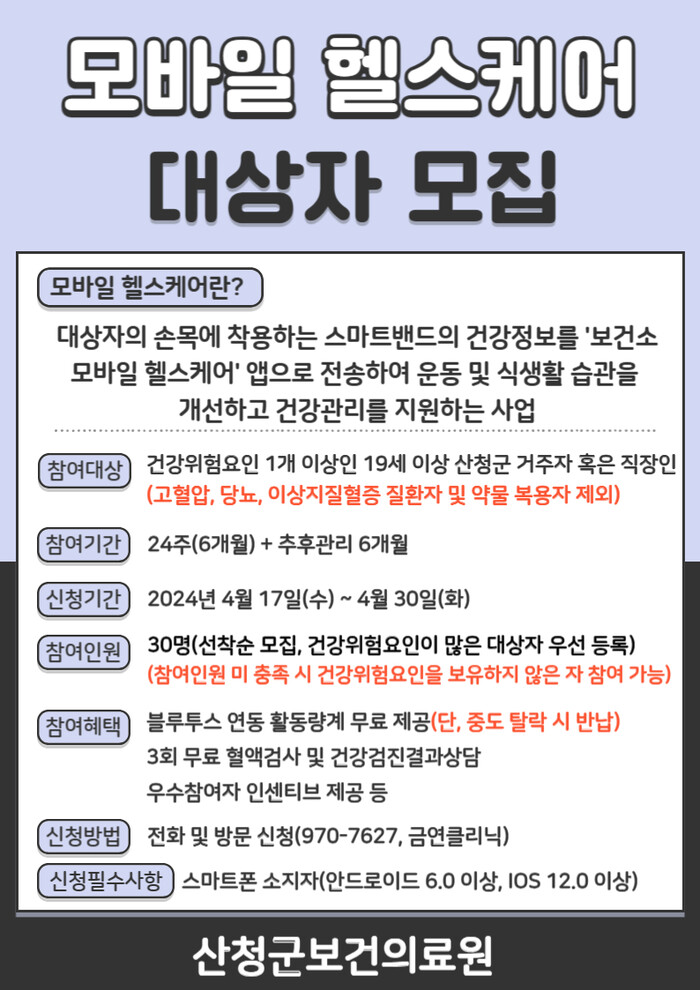 이번 모바일 헬스케어는 산청군보건의료원에서 제공하는 활동량계(스마트 워치)와 앱을 활용해 6개월간 건강관리 서비스를 제공하는 사업이다.