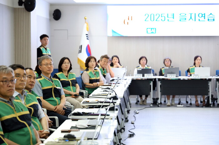 서울 구로구가 최근 구청 창의홀에서 ‘2025년 을지연습 준비보고회’를 개최했다. 을지연습은 정부 주관으로 매년 전국적으로 시행되는 전시·사변 또는 이에 준하는 비상사태 대응 훈련이다. 사진은 장인홍 구청장(왼쪽 네 번째)이 을지연습 준비사항을 듣고 있는 모습. (사진=구로구청 제공)