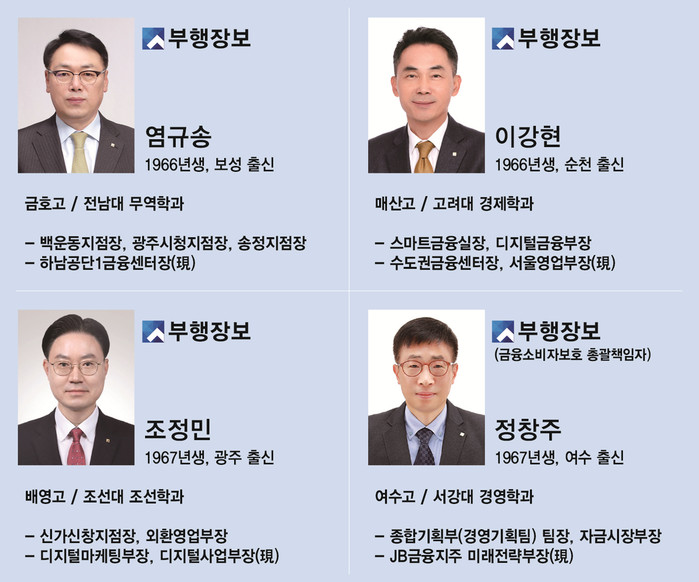 [시민일보 = 이대우 기자]광주은행(은행장 송종욱)은 임원급 부행장보 4명을 내부 발탁하여 선임하는 임원 인사를 단행했다고 밝혔다.