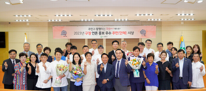 | ▲ 2023년 구정 언론 홍보 우수 주민(단체) 수여식에서 이성헌 구청장(앞줄 오른쪽 일곱 번째)이 표창 수여자 및 관계자들과 손가락 하트 모양을 만들어 보이며 기념촬영을 하는 모습. (사진=서대문구청 제공) |