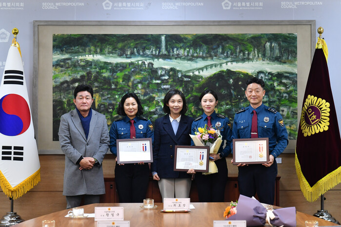 [시민일보 = 이대우 기자] 서울시의회(의장 최호정)가 최근 서초경찰서에서 학교폭력 업무를 전담하고 있는 SPO팀 5명(박진호 경감, 박원희·장지은 경위, 한은솔·정희진 경사)에게 서울시의장 표창을 수여했다.
