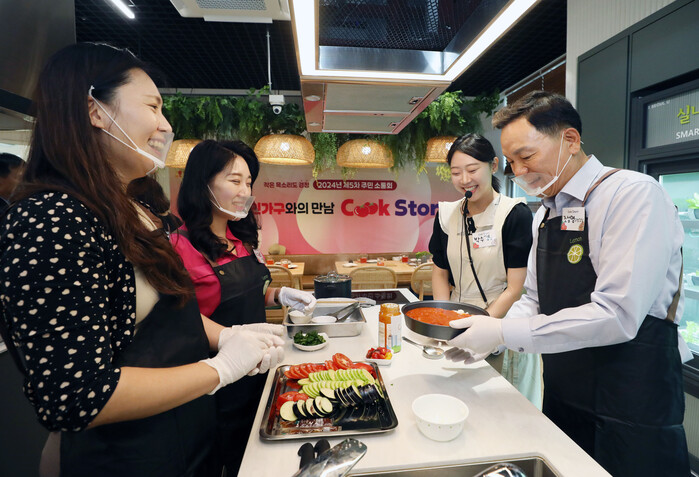 | ▲ 지난해 1인 가구와 함께 요리를 하는 조성명 강남구청장(오른쪽). (사진=강남구청 제공) |