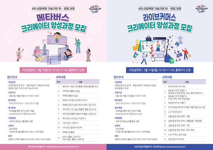 [시민일보 = 이대우 기자] 서울 서초여성가족플라자 서초센터(이하 서초센터)는 4차 산업혁명 기술기반 ‘메타버스 크리에이터’와 ‘라이브커머스 크리에이터’ 과정을 운영하기로 하고, 교육생을 각각 모집한다.