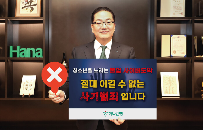 [시민일보 = 여영준 기자] 하나은행은 청소년 도박을 예방하고, 불법 사이버 도박의 위험성에 대한 사회적 인식 확산을 위한 '청소년 도박 근절 릴레이 캠페인'에 이호성 하나은행장이 동참했다고 9일 밝혔다.