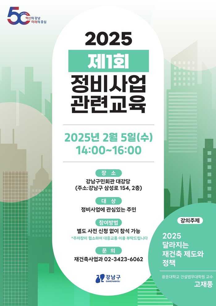 조성명 강남구청장은 “이번 강의가 2025년 변화하는 재건축 제도에 대한 구민들의 궁금증을 해소하고, 정비사업 추진에 도움이 되길 기대한다”며 “아카데미와 함께 재건축드림지원TF 자문위원의 현장 교육과 갈등 조정 지원을 통해 재건축 속도에 박차를 가하겠다”고 밝혔다.