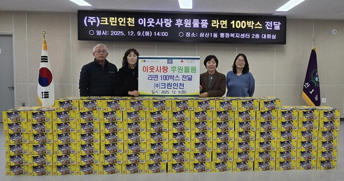 [인천=문찬식 기자] 인천 부평구 삼산1동은 지난 9일 ㈜크린인천으로부터 라면 100박스를 전달받았다.