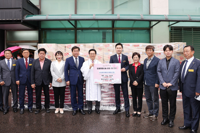 서울 도봉구는 최근 (사)에이레네사회복지회로부터 지역 취약계층을 위한 쌀을 전달받았다. 쌀은 14개동 주민센터를 통해 300가구의 취약계층과 노인에게 전달됐다. 사진은 오언석 구청장(오른쪽 다섯 번째)이 기념촬영을 하는 모습. (사진제공=도봉구청)