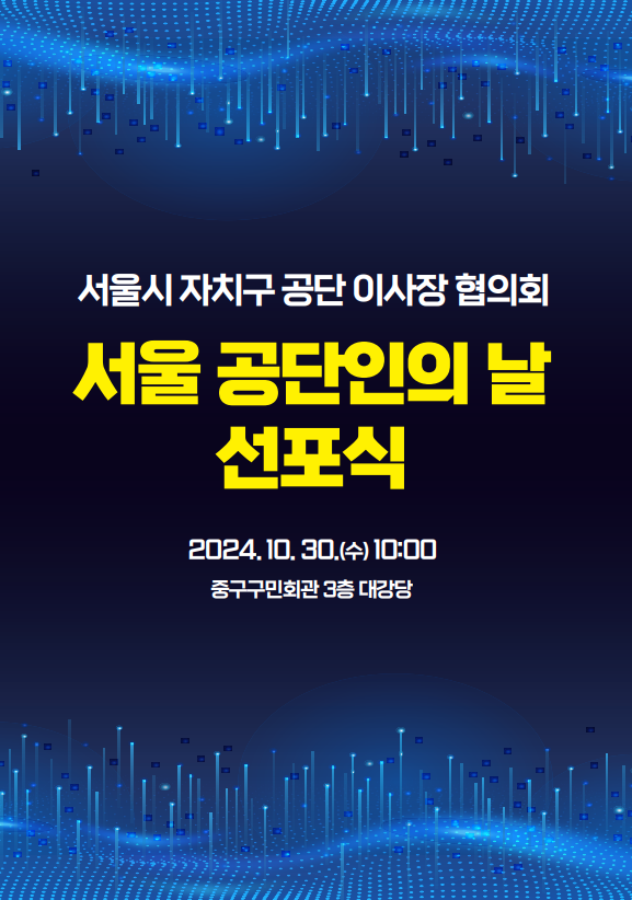 [시민일보 = 문민호 기자] 10월 30일, 서울시자치구공단 이사장 협의회가 서울시 지방공단 임직원의 화합과 지역주민의 복리 증진에 기여함을 기념하기 위한 서울 공단인의 날 선포식을 개최한다.