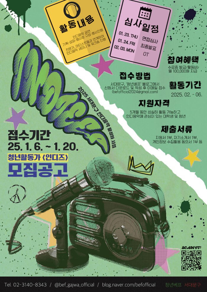 이성헌 서대문구청장은 “독창성과 열정을 지닌 청년들이 이번 지원 프로그램을 통해 인디음악 문화의 새로운 주역으로 자리 잡을 수 있길 기대한다”고 말했다.