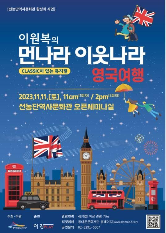 [시민일보 = 이대우 기자] 서울 동대문문화재단이 오는 11월11일 선농단역사문화관 오픈 세미나실에서 ‘클래식이 있는 뮤지컬 : 먼나라 이웃나라-영국여행’ 공연을 선보인다.