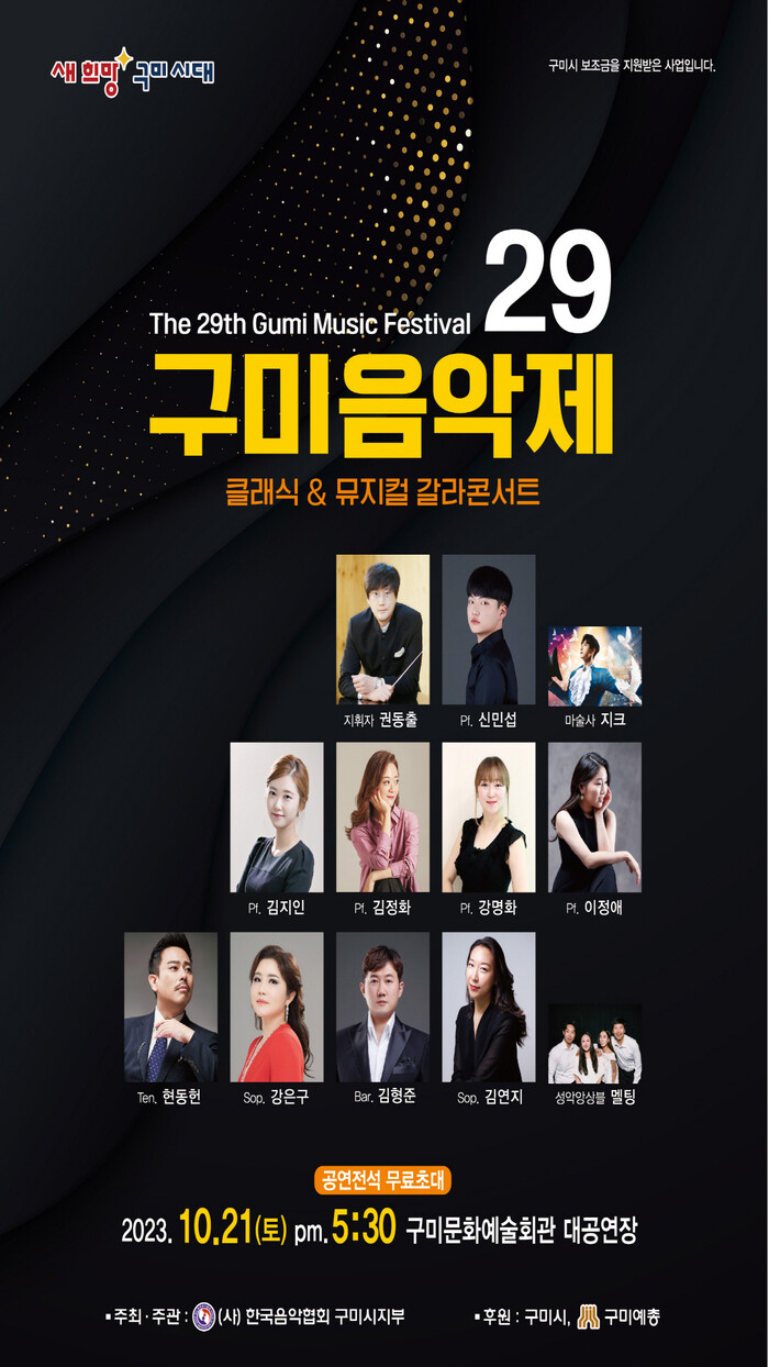 [구미=박병상 기자] 경북 구미시가 오는 21일 문화예술회관 대공연장에서 (사)한국음악협회 구미지부 주관으로 '2023년 제29회 구미 음악제'를 개최한다.