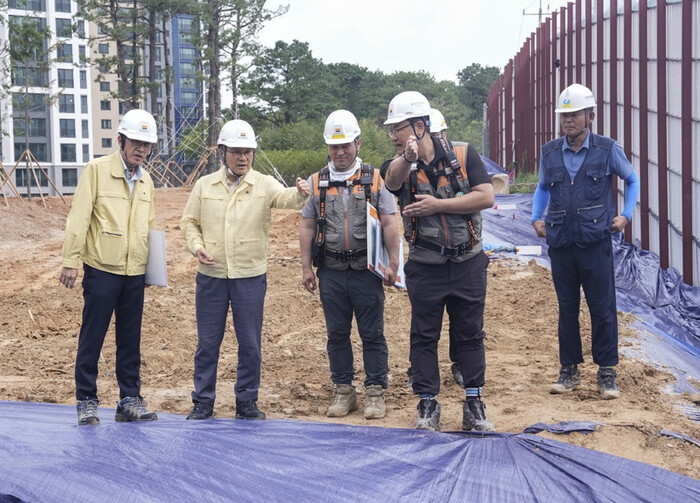 [광주=정찬남 기자] 강기정 광주광역시장(왼 쪽부터 두 번째)이 7일 오전 서구 금호동 아파트 건설 현장을 찾아 지난 3일 새벽 집중 호우로 인한 토사 유출 현장을 점검하고 있다./광주광역시 제공