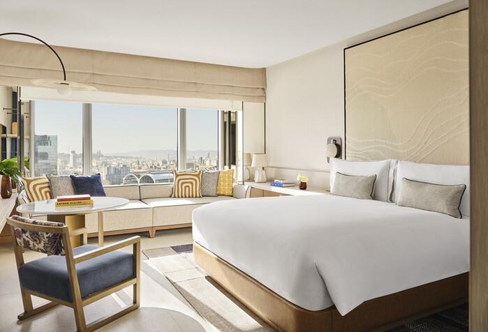 스위트룸은 약 80㎡의 규모로 산과 바다의 실루엣, 흙의 질감과 같은 자연의 요소를 반영한 디자인이 특징이며, 탁 트인 조망과 넓은 공간감을 최우선으로 고려했다. 특히 스카이라인 시티 뷰(Skyline City View) 와 호라이즌 시 뷰(Horizon Sea View) 스위트는 건물 코너에 위치해 바르셀로나의 아름다운 전경을 즐길 수 있고, 객실 내 각 공간이 자연스럽게 연결되는 오픈 플랜 구조로 설계했다.