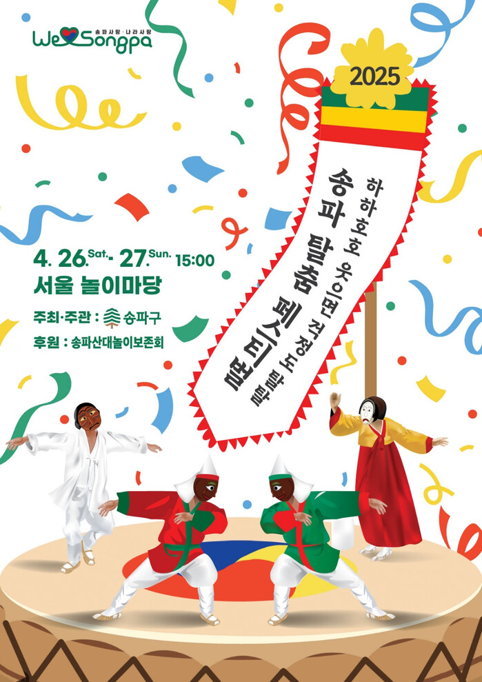 [시민일보 = 이대우 기자] 서울 송파구(구청장 서강석)가 전통마당극장인 ‘서울놀이마당’에서 오는 26~27일 ‘2025 송파 탈춤 페스티벌’을 개최한다고 밝혔다.