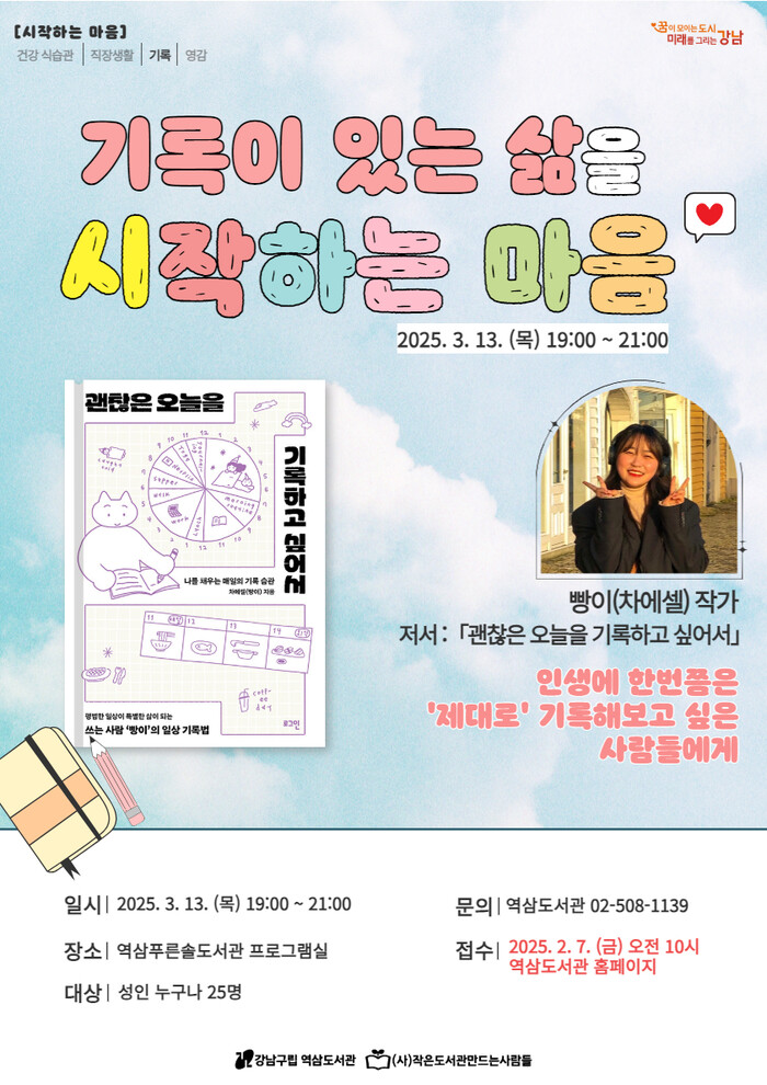 [시민일보 = 이대우 기자] 강남구립역삼도서관은 2월 20(목)부터 3월 20일(목)까지 매주 목요일 저녁 총 4회에 걸쳐 <시작하는 마음>을 진행한다. 이번 프로그램은 새해의 시작과 함께 새로운 목표를 다짐한 이용자들을 응원하고, 이를 실천하기 위한 구체적인 계획을 세울 수 있도록 돕고자 기획되었다.