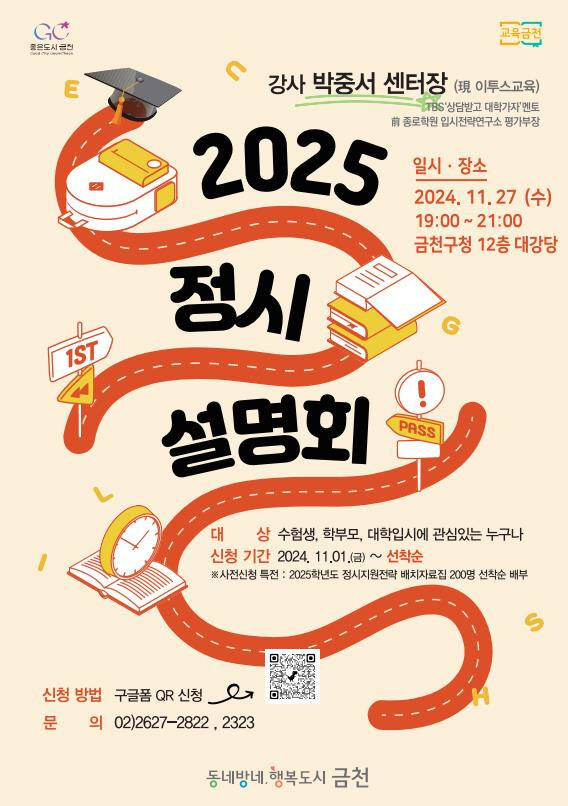 [시민일보 = 여영준 기자] 금천구(구청장 유성훈)는 오는 27일 오후 7시 금천구청 12층 대강당에서 2025학년도 정시 대비 입시설명회를 개최한다고 밝혔다.