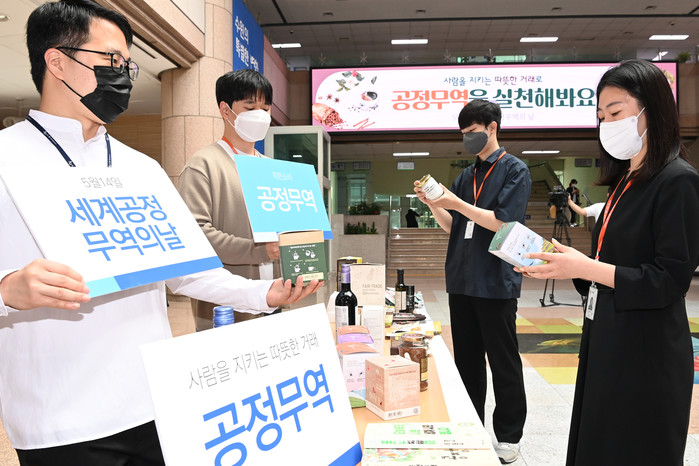 경기 수원시가 세계공정무역의 날을 맞아 지난 12일 ‘착한소비! 공정무역 캠페인’을 전개했다. 이날 캠페인에서는 공정무역을 홍보하고, 출근하는 직원에게 공정무역 원두로 만든 ‘드립백 커피’와 ‘공정무역 캔디’를 나눠줬다. 사진은 이날 캠페인이 진행되고 있는 모습. (사진제공=수원시청)