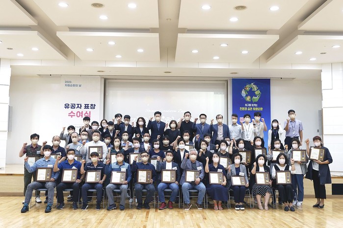 서울 은평구가 최근 제14회 자원순환의 날을 맞아 ‘유공자 표창 수여식’을 진행했다. 표창 대상자는 총 40명으로 환경공무관, 청소대행업체 직원 등이다. 사진은 이날 김미경 구청장(둘째줄 가운데)이 표창 수여자들과 기념촬영을 하는 모습. (사진제공=은평구청)
