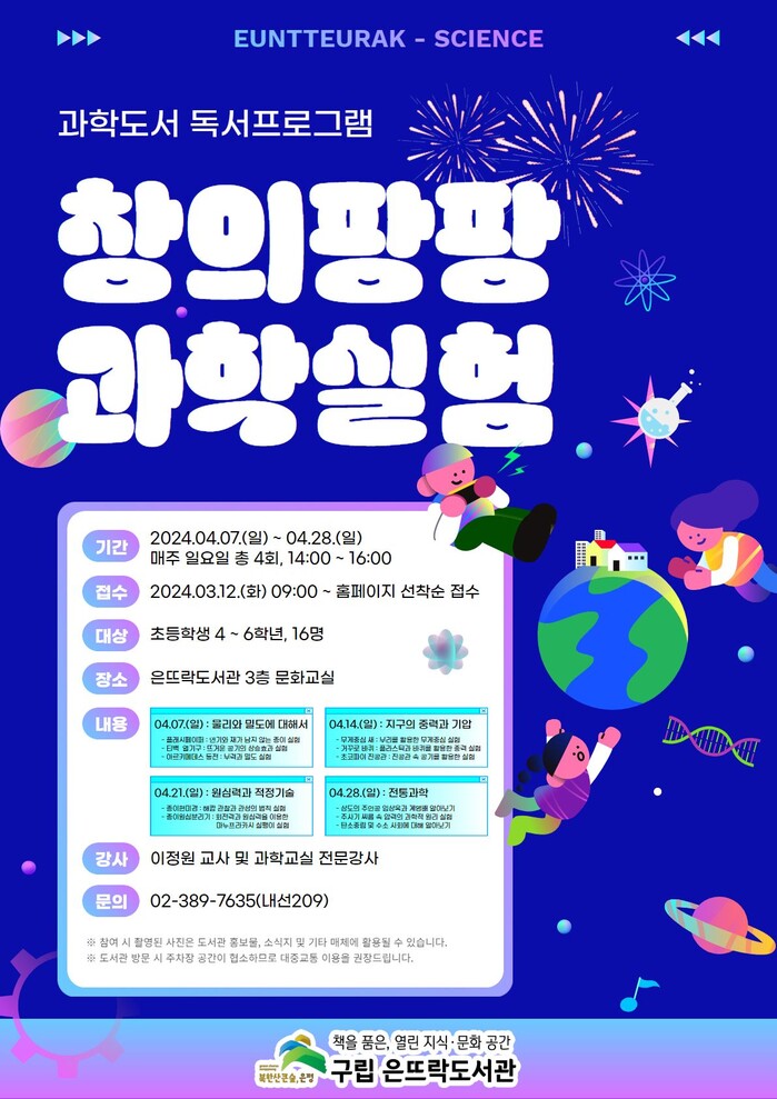 구립 은뜨락도서관 관계자는 “과학 도서 독서프로그램을 통해 어린이들의 과학 탐구심을 키우고 독서 흥미에 많은 관심과 긍정적인 자극이 됐으면 한다”고 말했다.