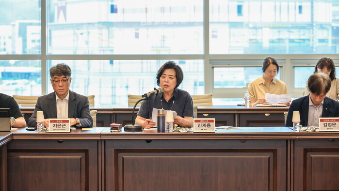 경기 과천시가 최근 지식정보타운 디테크타워에서 ‘2025년 제2차 지식정보타운 실무협의체 회의’를 열고 입주자 대표단, 과천경찰서 등 관계기관과 함께 정주환경 개선 방안을 논의했다. 사진은 회의를 주재하는 신계용 시장(가운데)의 모습. (사진=과천시청 제공)