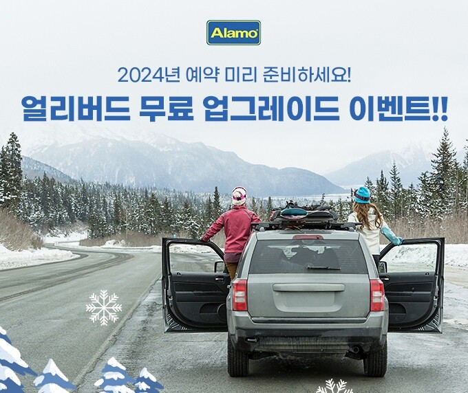 신규 예약 시 코드 입력 란에 업그레이드 쿠폰(ALAMO2024)을 입력 후 차량 등급 선택 시 한 등급씩 무료 업그레이드가 적용된다.