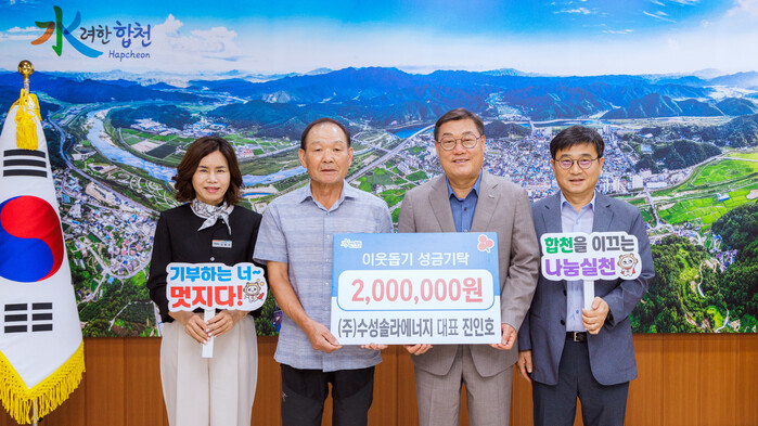 김윤철 합천군수는 “지역사회의 어려운 이웃들을 위해 따뜻한 나눔을 실천해주셔서 감사드리며, 전달해주신 성금은 도움이 필요한 이웃에게 잘 전달되도록 하겠다”고 감사의 마음을 전했다.