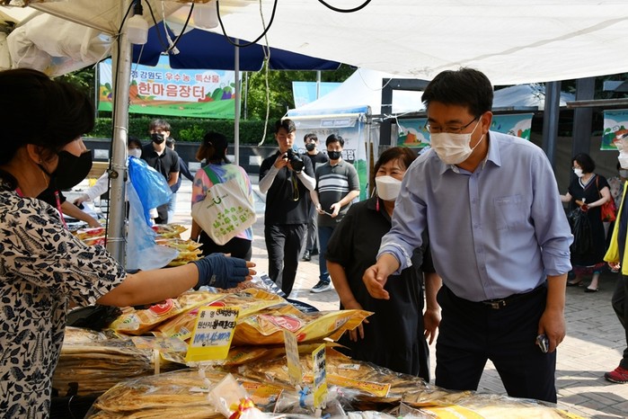 오승록 서울 노원구청장이 최근 중계근린공원에서 진행된 강원도 농산물 직거래 장터에 방문했다. 장터는 판매장 40동 규모이며, 주요 품목은 강원 한우·버섯·더덕 등이다. 사진은 오 구청장(오른쪽)이 장터를 방문해 판매장을 둘러보고 있는 모습. (사진제공=노원구청)