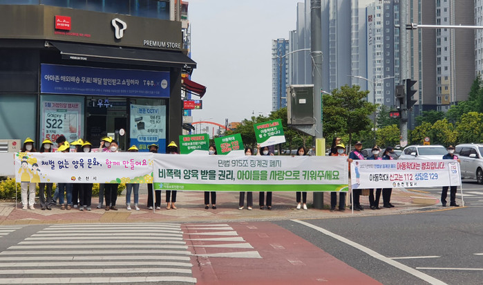 전남 순천시가 지난 12일 해룡면 신대지구 향매지하차도 앞 사거리에서 ‘체벌 없는 긍정양육’과 ‘이웃의 관심’을 주제로 아동학대 예방을 위한 유관기관 합동 캠페인을 전개했다. 사진은 이날 캠페인이 진행되고 있는 모습. (사진제공=순천시청)