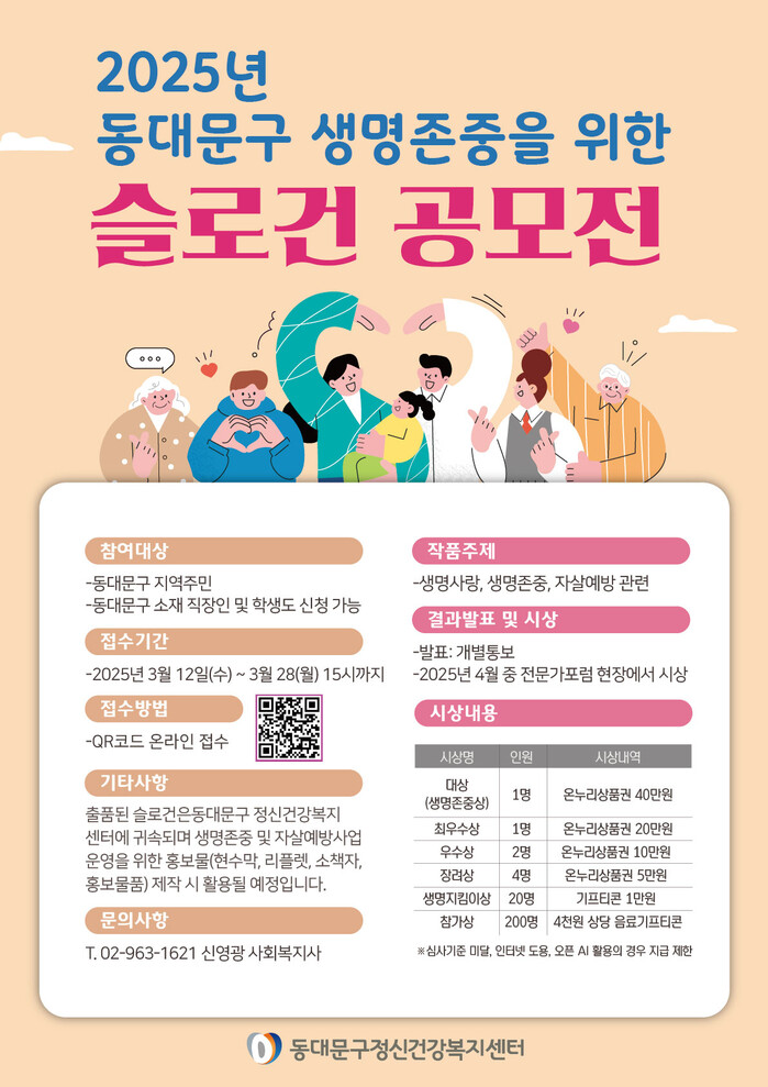 [시민일보 = 이대우 기자] 동대문구(구청장 이필형)는 자살 예방의 중요성을 알리고 생명 존중 문화를 확산하기 위해 ‘2025년 생명 존중 슬로건 공모전’을 개최한다.