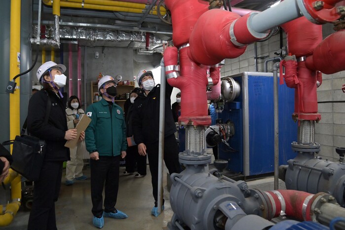 김길성 서울 중구청장이 노후화된 공동주택과 요양원, 쪽방촌 등 총 29곳을 찾아 중부소방서 등 관계기관과 합동점검을 실시했다. 사진은 최근 김 구청장(가운데)이 구립중구노인요양센터를 방문해 화재취약시설을 점검하고 있는 모습. (사진=중구청 제공)