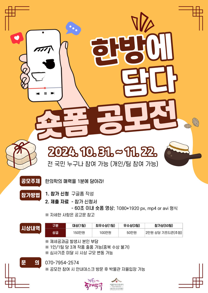 숏폼 공모전 ‘한방에 담다’는 한의학의 우수성과 매력에 대한 대중 관심을 제고하고자 기획됐다. 구는 ▲한의약의 가치 ▲서울한방진흥센터 프로그램 ▲서울약령시 활성화 등을 주제로 한 재밌고 참신한 영상을 기다리고 있다.