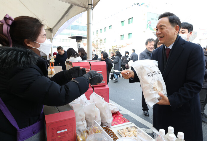 | ▲ 강남구 설맞이 직거래 장터에 참여한 조성명 강남구청장. |