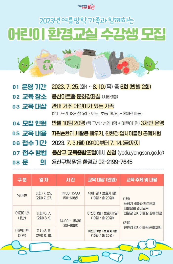 [시민일보 = 홍덕표 기자] 서울 용산구(구청장 박희영)가 여름방학을 맞아 '부모와 함께하는 어린이 환경교실'을 무료로 운영, 오는 14일까지 참여 가족을 모집한다.