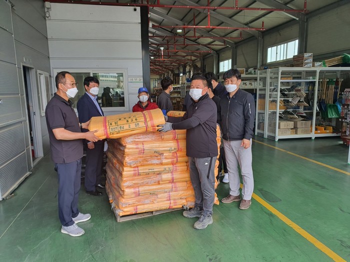 충남 예산군이 품질이 뛰어난 예산고추의 둔갑·판매를 방지하고 고추실명제로 경쟁력 강화에 기여하기 위해 올해 신규 시책으로 추진하는 고추재배농가포대지원사업과 관련해 고추포대를 본격 배부한다. 사진은 13일 예산군 신양농협에서 사업선정 농가에 고추 포대를 배부하는 모습. (사진제공=예산군청)
