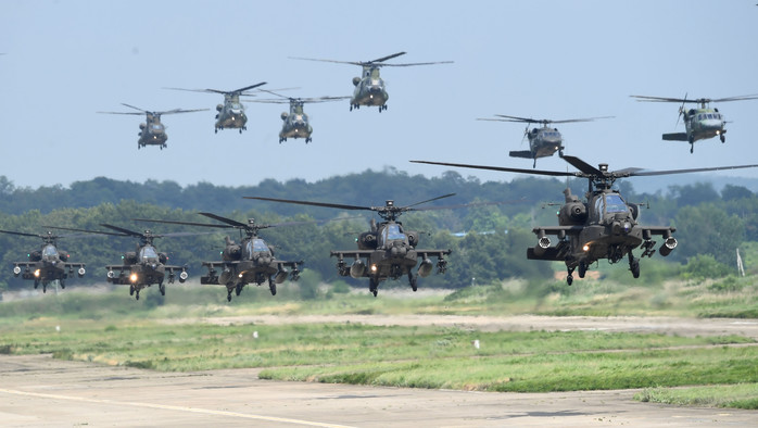 지난 25일 오후 경기도 이천 육군항공사령부에서 열린 대규모 항공작전 훈련에서 AH-64E 아파치, UH-60P 블랙호크, CH-47D 시누크 헬기가 동시 이륙을 하고 있다.