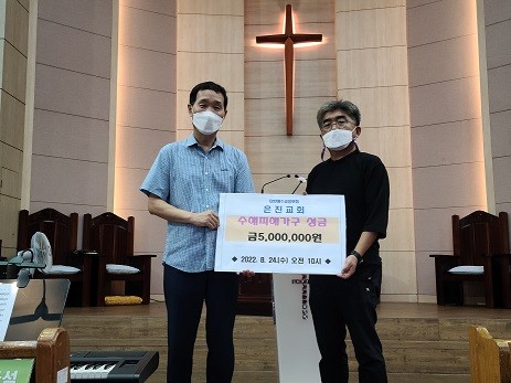 서울 은평구 갈현1동은 최근 은진교회 후원으로 ‘수해복구성금 전달식’을 개최했다. 은진교회는 최근 수해로 고통받는 주민을 위해 써달라며 사랑과 정성을 모은 성금 총 500만원을 기탁했다. 성금은 사회복지공동모금회를 통해 수해피해 10가구에 각 50만원이 전달됐다. 사진은 전달식에서 관계자들이 기념촬영을 하는 모습. (사진제공=은평구청)