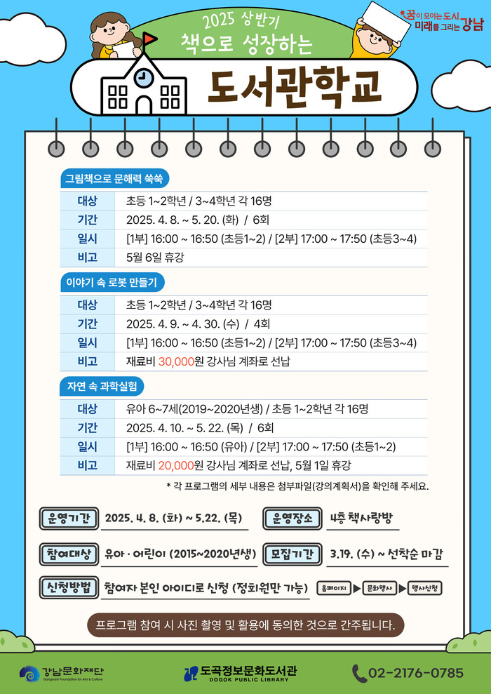 [시민일보 = 이대우 기자] (재)강남문화재단이 운영하는 도곡정보문화도서관에서 유아 및 어린이를 위한 독서 프로그램인 ‘책으로 성장하는 도서관학교’를 4월 8일(화)부터 5월 22일(목)까지 운영한다.