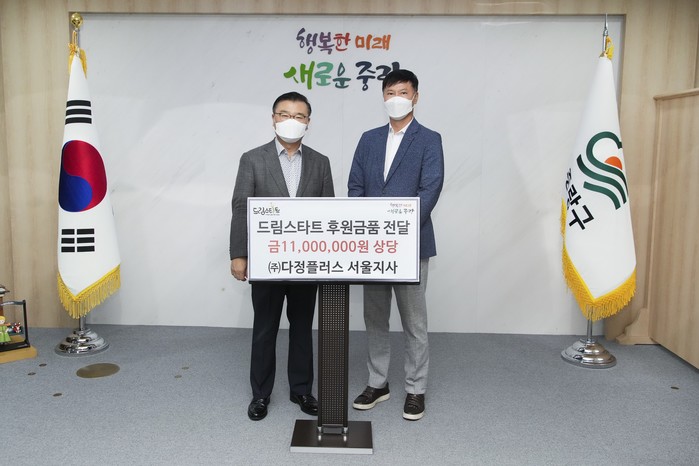 서울 중랑구는 최근 (주)다정플러스 서울지사로부터 드림스타트 대상 아동을 위한 1100만원 상당의 후원금품을 전달받았다. 온누리상품권은 저소득 취약계층에 전달될 예정이며, 후원금은 드림스타트 대상 10가정을 지정해 중랑구사회복지협의회를 통해 전달될 예정이다. 사진은 류경기 구청장(왼쪽)과 손정도 총괄본부이사가 기념촬영을 하는 모습. (사진제공=중랑구청)
