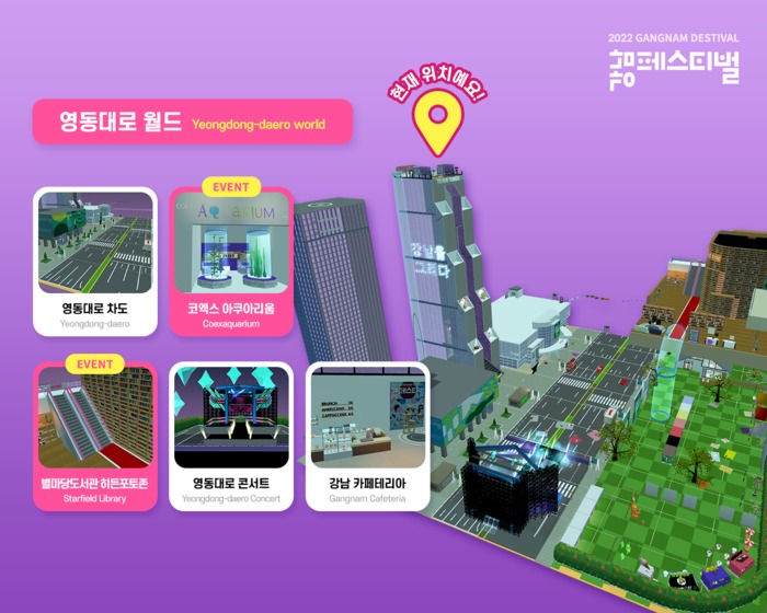 ‘메타버스 강남빌리지’는 강남구 주요 관광권역인 ▲영동대로 코엑스 ▲강남역/신사 가로수길 ▲양재천/봉은사 등 3곳을 제페토 플랫폼 내에 구현했다. 또 30일에 시작하는 강남페스티벌과 연계해 메타버스 속 영동대로 K-POP 콘서트, 마루공원 콘서트 무대 등에서 축제를 즐기고 다양한 미션 이벤트를 즐길 수 있게 했다.
