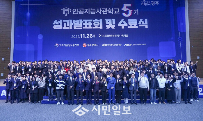 | ▲ 강기정 광주광역시장(사진 앞줄 가운데)이 2024년 11월26일 오후 서구 김대중컨벤션센터에서 열린 ‘광주인공지능사관학교 5기 성과공유회 및 수료식’에 참석해 교육생들과 기념촬영을 하고 있다. /광주광역시 제공 |