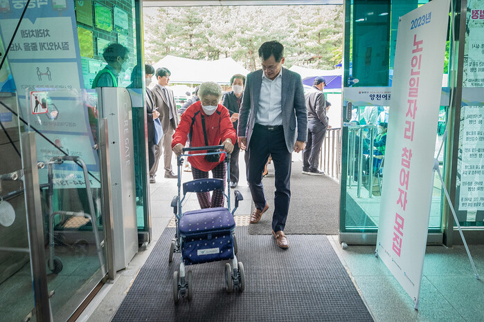 | ▲ 지난 4월 보행기를 이용하는 노인과 함께 복지관에 입장중인 이기재 구청장. (사진= 양천구청 제공) |